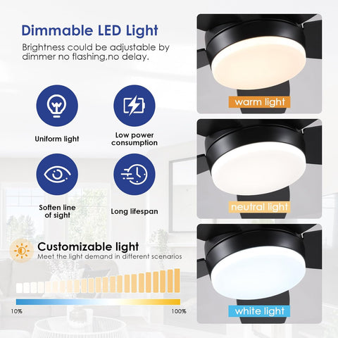 The 48 Inch Black Ceiling Fans with Lights Led and Remote Control. The overall design is simple and practical, and most of the complex installation procedures are already completed with detailed installation instructions. This model is not suitable for use in an environment exposed to rain and sunlight.