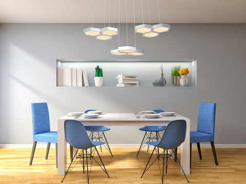 Brighten up your space with the contemporary Hampton LED pendant in a chrome finish. The reflective hexagonal canopy is as if a mirrored image of the hexagonal lights that shine below, shimmering with confidence and contemporary charm. Stylish and functional, this light will greet your guests with stylish luxe in any space.